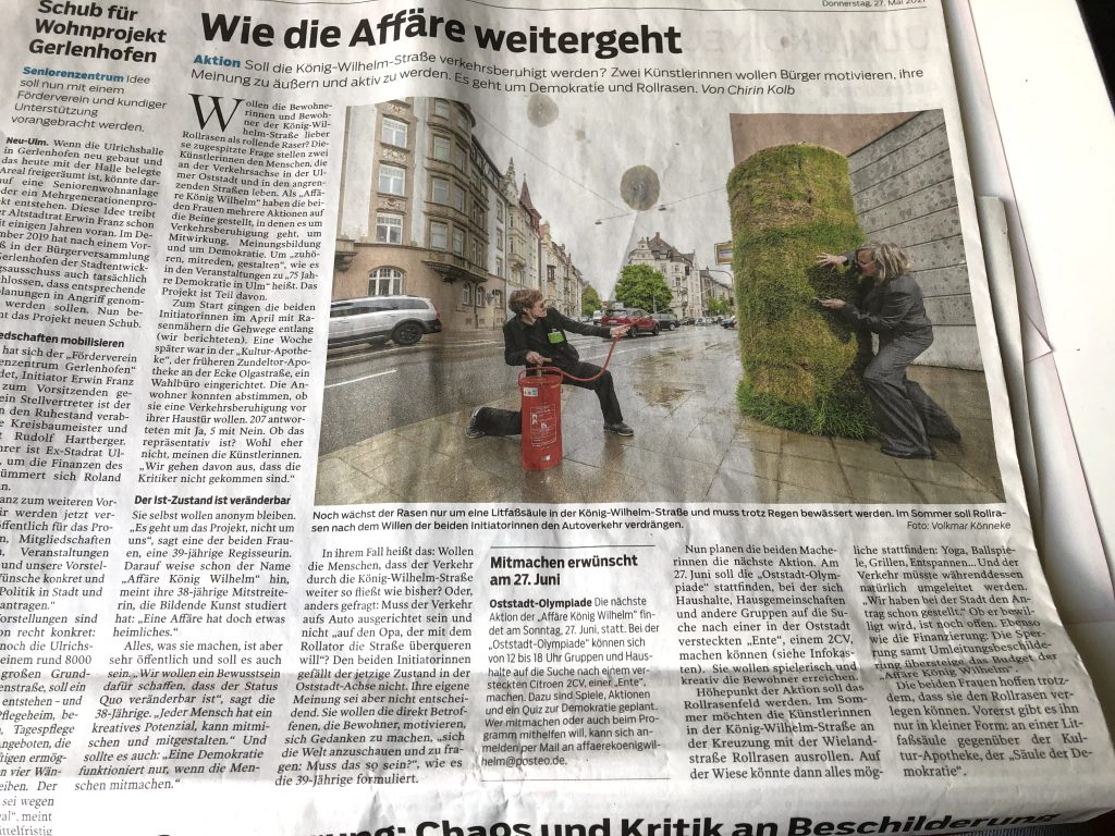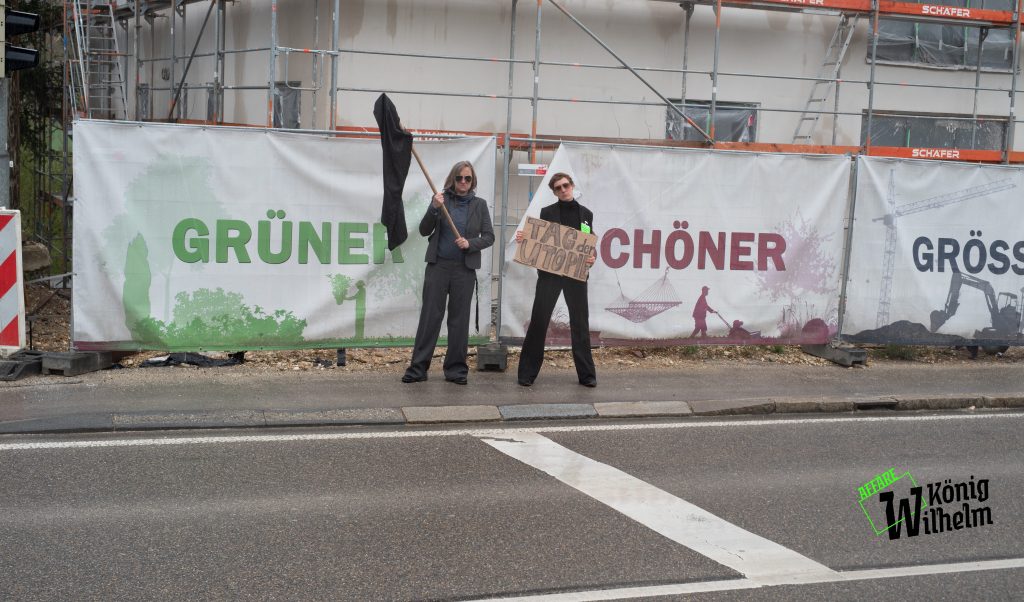 Coronabedingt konnte unser geplantes Straßenfest, der Tag der Utopie mit Straßensperrung nicht stattfinden. Die Affäre König Wilhelm trauert um das geplante Manifest demokratischer Eroberung öffentlichen Stadtraums, zugleich brütet sie über neuen Plänen und plant eine coronakonforme Ersatz-Aktion schon bald, für den 27. Juni 21.