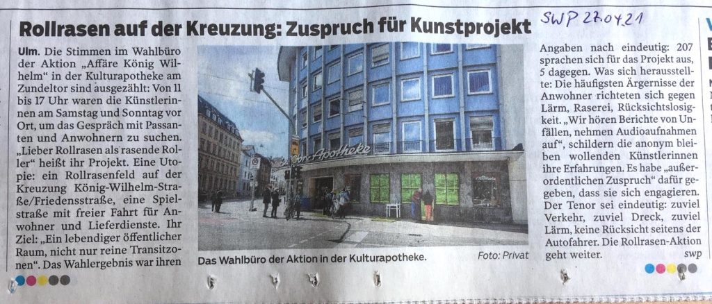 Bemühungen, über den Weg der Stadtverwaltung eine Umsetzung des Experimentierfeldes Rollrasen zu erlangen, erklären wir nach Monaten hartnäckiger Korrespondenzen als gescheitert. Uns interessiert nun: wie steht die Politik, also die demokratisch gewählten Vertreter:Innen der Fraktionen zum Rollrasenfeld auf der König-Wilhelm-Straße?!