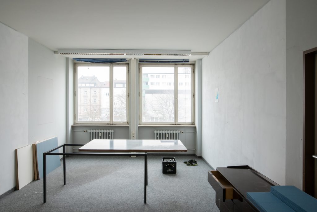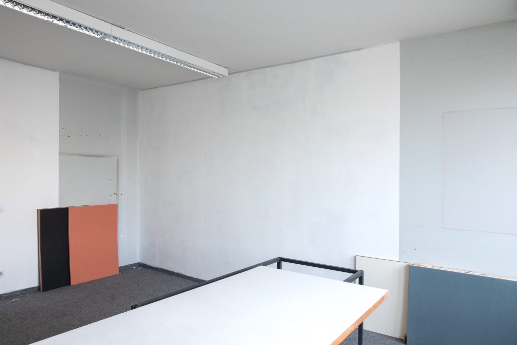 (…2:1 stellt die Übertragung der Ordnungsprinzipien der Fassade des Atelier-Hauses ins Atelier dar, ein Einstülpen der Proportionen dieser Fassade in die Anordnung des Handlungsfeldes im Atelierraum. Raumstruktur und Aufteilung der Dinge orientieren sich am mathematisch angelegten Kanon der Architektur des repräsentativen Außen. Tisch, Stuhl, Wände, Arbeitsmaterial, Schuhe, Kommode transformieren sich durch ein Regelsystem und koordinieren sich in einem freien Spiel in ganz eigener Harmonie im Raum … Text: Christoph Sehl)