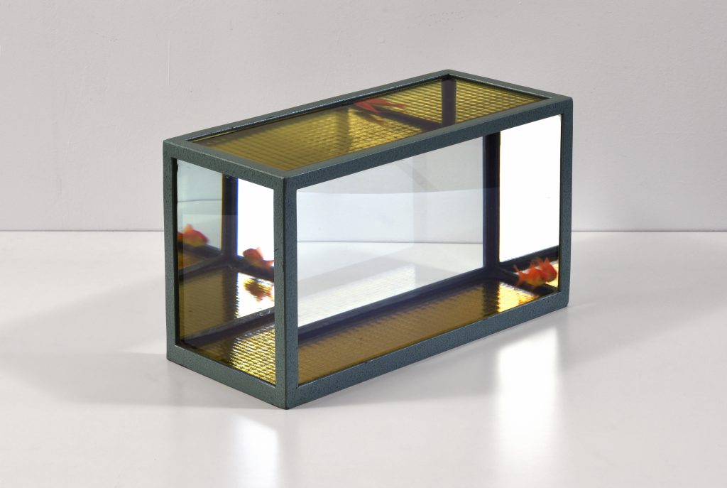 Silvia Keppler zeigt in einer Videoarbeit eine rätselhafte kubische Form. Grünlich lackierte Stahlprofle defnieren einen rechteckigen Körper, der schräg vor einer weißen Wand steht. Der Boden des Objekts bildet gelb eingefärbtes Sicherheitsglas. Glaswände befnden sich zwischen den Proflen. Im Inneren dieser eigentlich so klaren geometrischen Form öfnen sich jedoch weitere Räume. Der Betrachter wird mit verschobenen Teilansichten der Wände und des Bodens konfrontiert. Ein kleiner Goldfsch bewegt sich in dem Körper und defniert den Raum. Dieser tierische Körper in dem dinglichen Körper vervielfacht sich je nachdem, wo er sich befndet oder er verschwindet sogar für einen kurzen Moment.