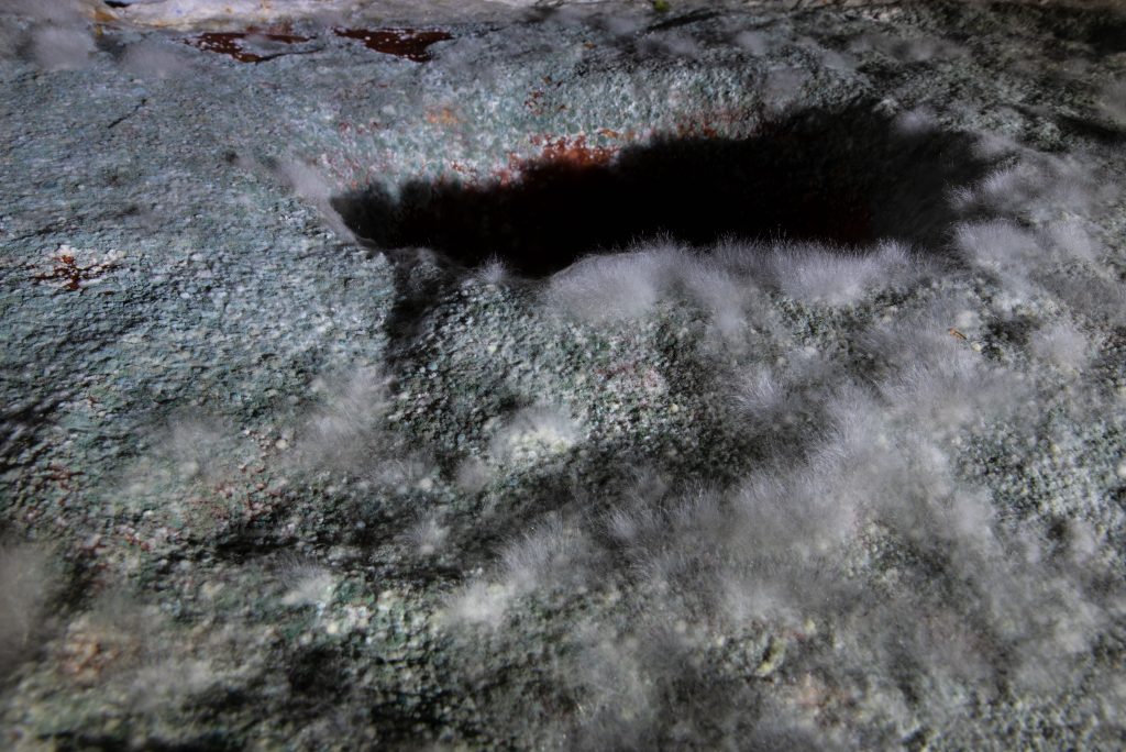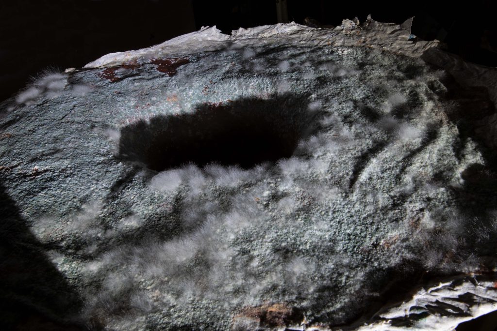 (trichterförmiges Objekt aus Pappmaché, ca. 120x120cm groß, Substrat, 12 Tage in einem dunklen Keller exponiert, von in der Luft befindlichen Sporen befallen und überwuchert