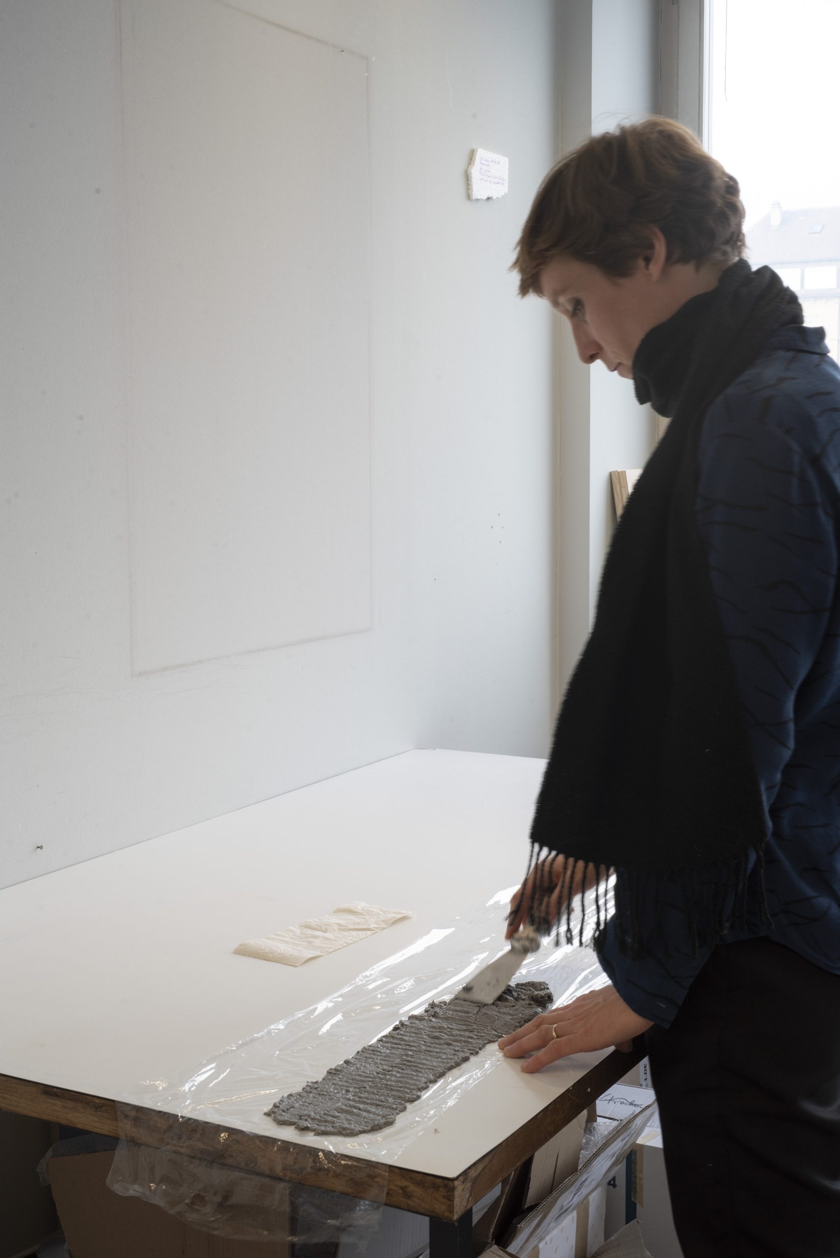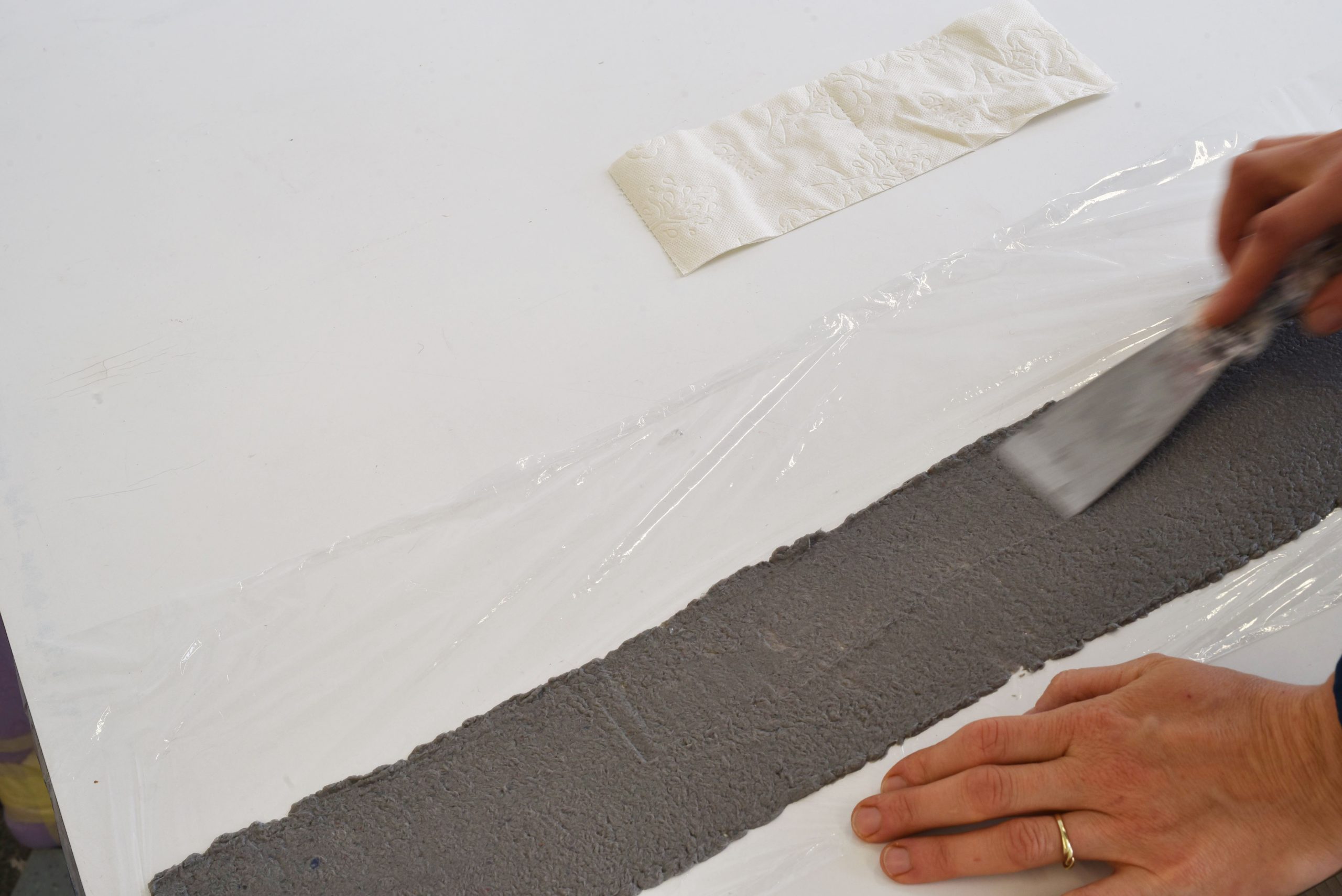 Pappmaché wird als Streifen auf der Länge eines Tisches ca. 2mm-dick aufgetragen.